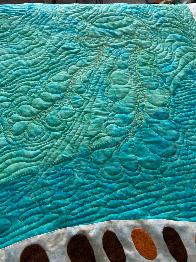 Lesson for the log book: I love the jellyfish that I quilted in, which is why it’s listed above, but it doesn’t stand out in the overall photo. I picked what I considered to be a bright yellow so it would stand out. Here, I’ve learned more about what causes quilting to stand out – that it isn’t only the coloring of the thread but also the spacing and pattern. If I had the jellyfish on the background pieces with the primarily horizontal quilting, I believe it would have stood out more.