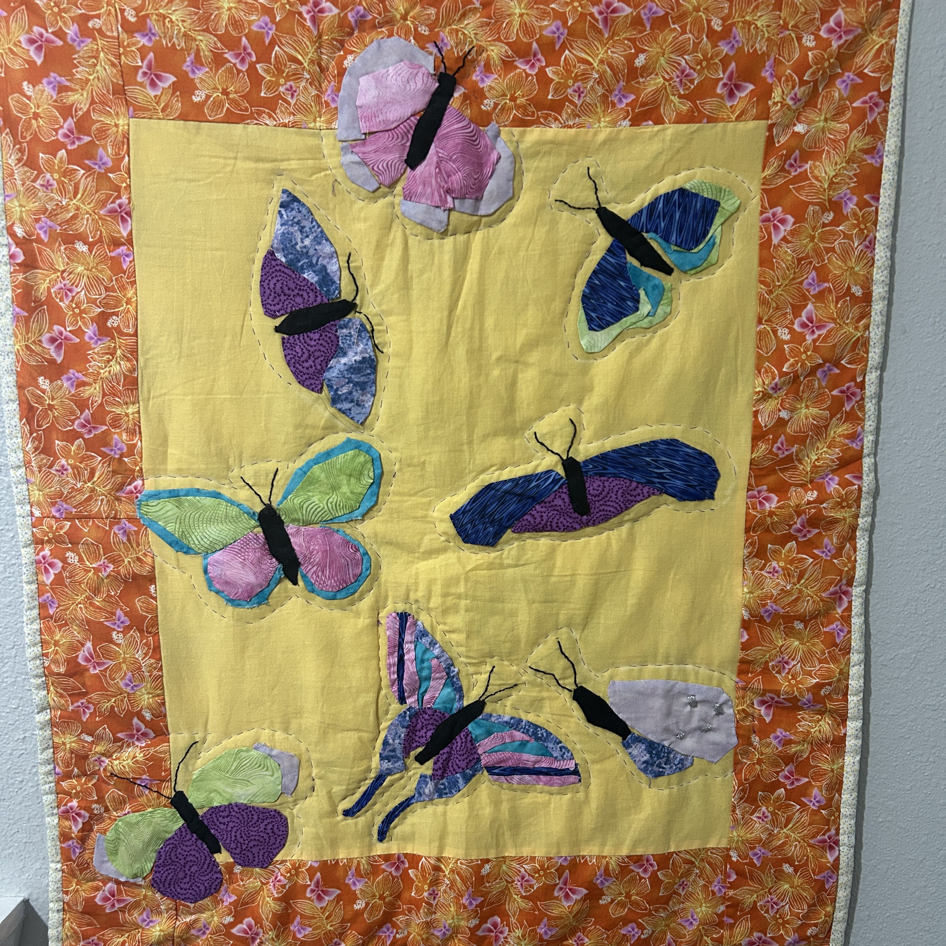 It wasn’t long before I asked Grandma for a book (my other passion), which had butterfly appliquĂ© patterns. I remember her trying to help me pick fabrics with colors appropriate for butterflies, but all I could grasp was “butterfly fabric,” which is how the borders, backing, and bright yellow background were picked. But I was only a couple years into this hobby.