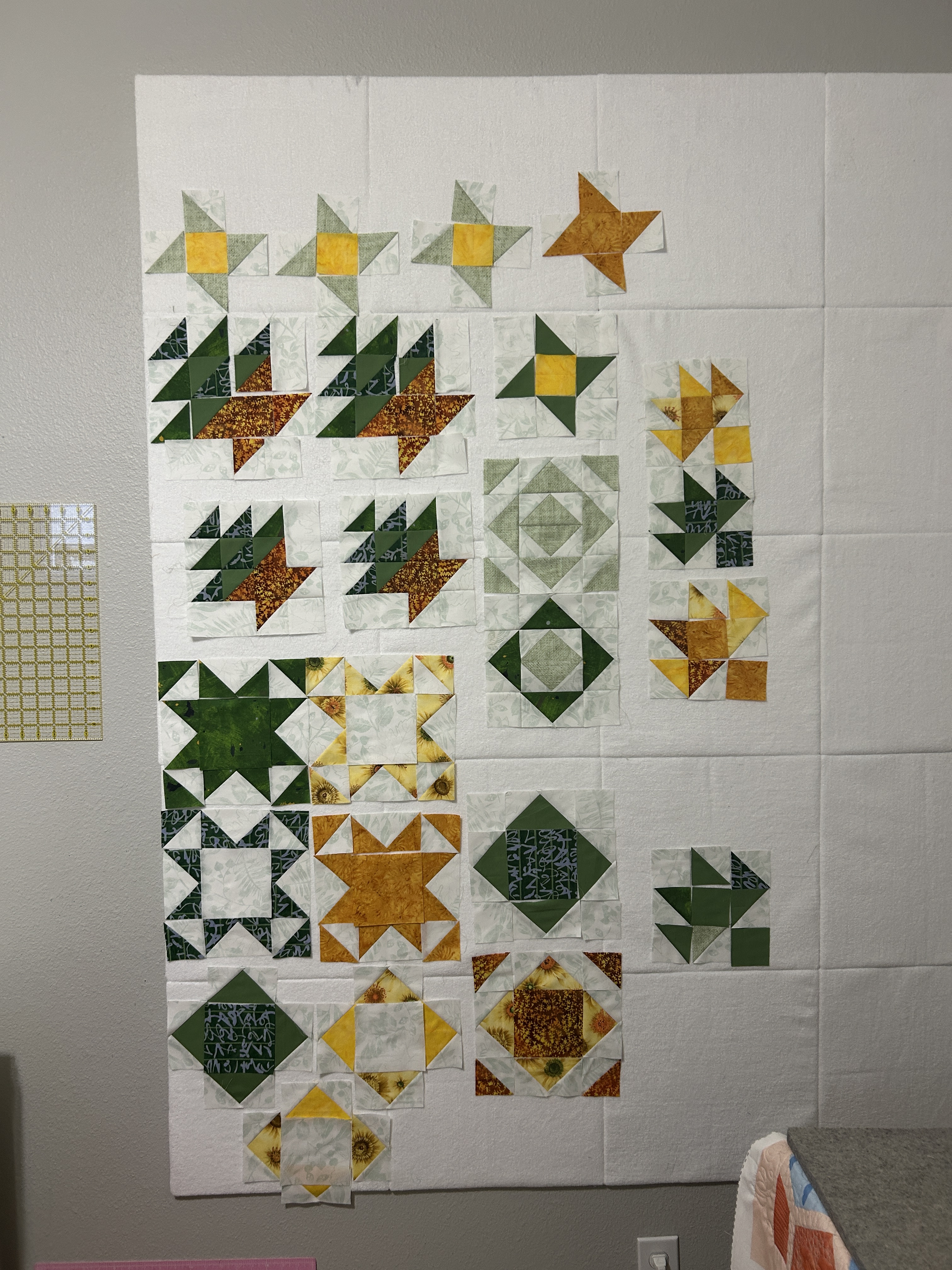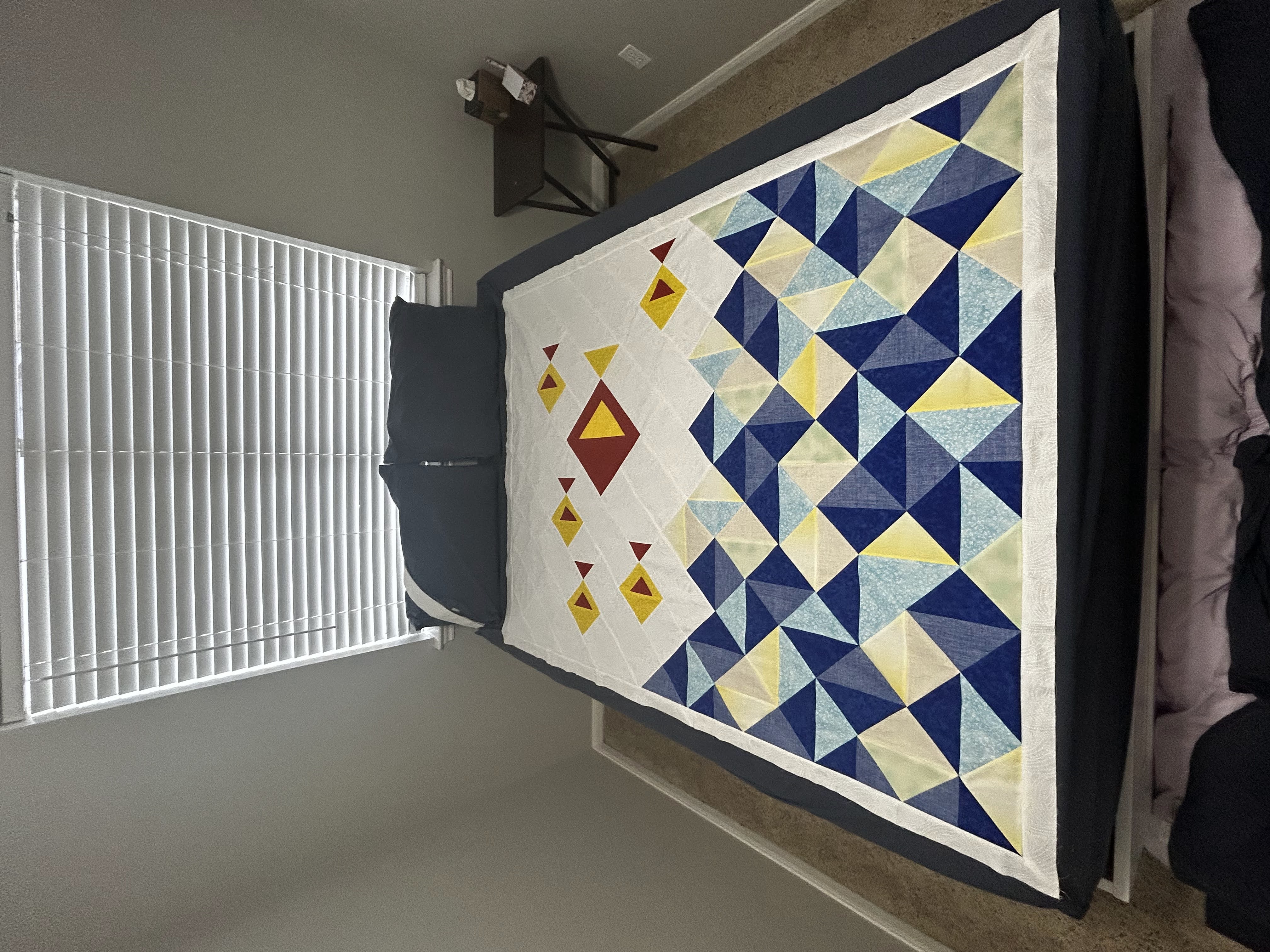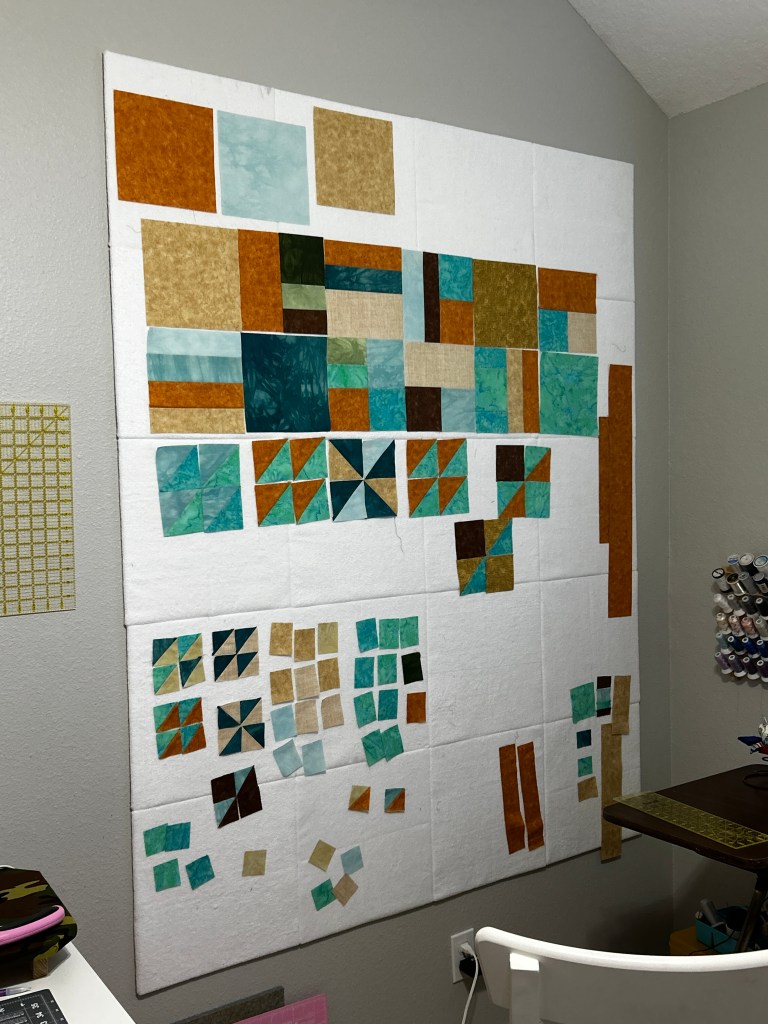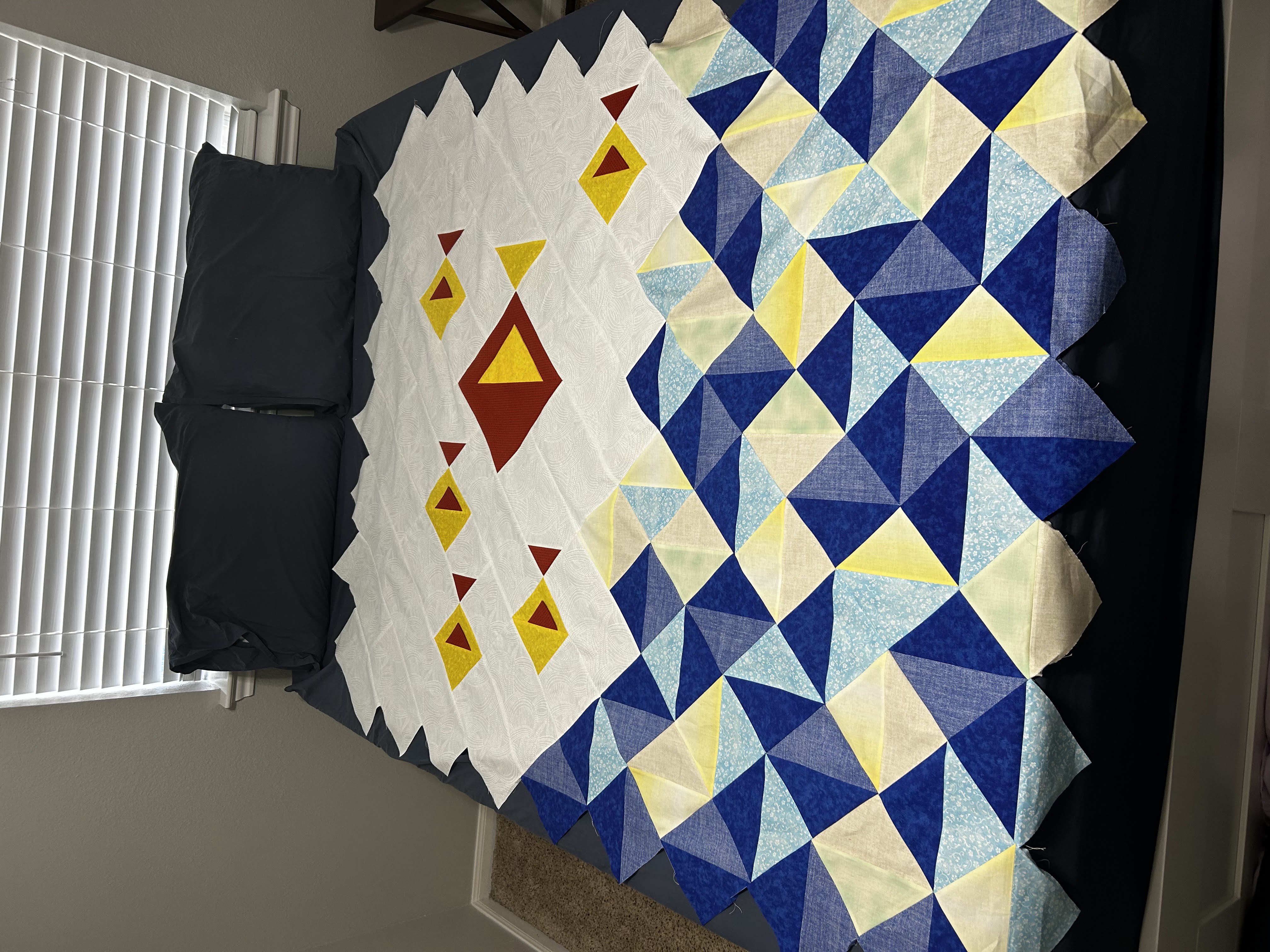 I drew the pattern out in EQ8 then calculated the cuts for yardage, writing out all the steps. I did make these HST as 4-at-a-time because they seemed quite large for 8-at-a-time. I never thought about the biased edges and I wasn’t a starch user when I finished this. I don’t remember particular issues with deformation, but with my ironing and seam consistency habits, I feel like I have issues with block size all the time 🤣