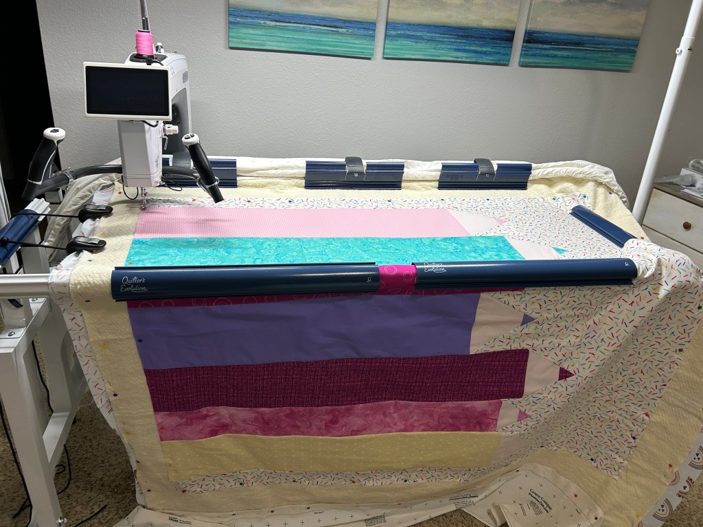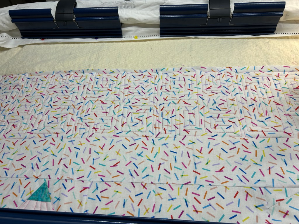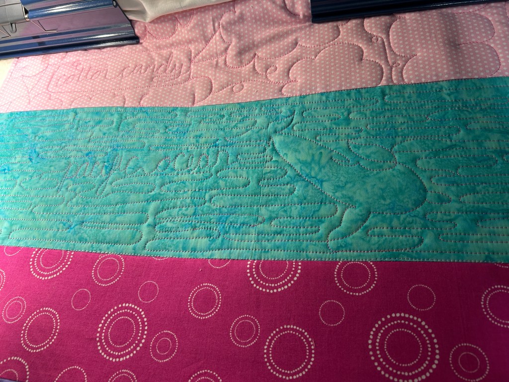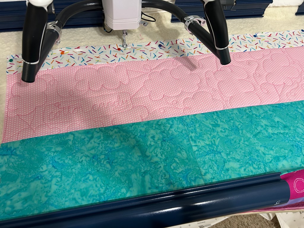 I had so much fun quilting on my long arm. I was trying to get this finished before my friend had her baby so I didn’t “waste” any time practicing on other fabric. I got the machine set up and started quilting.
