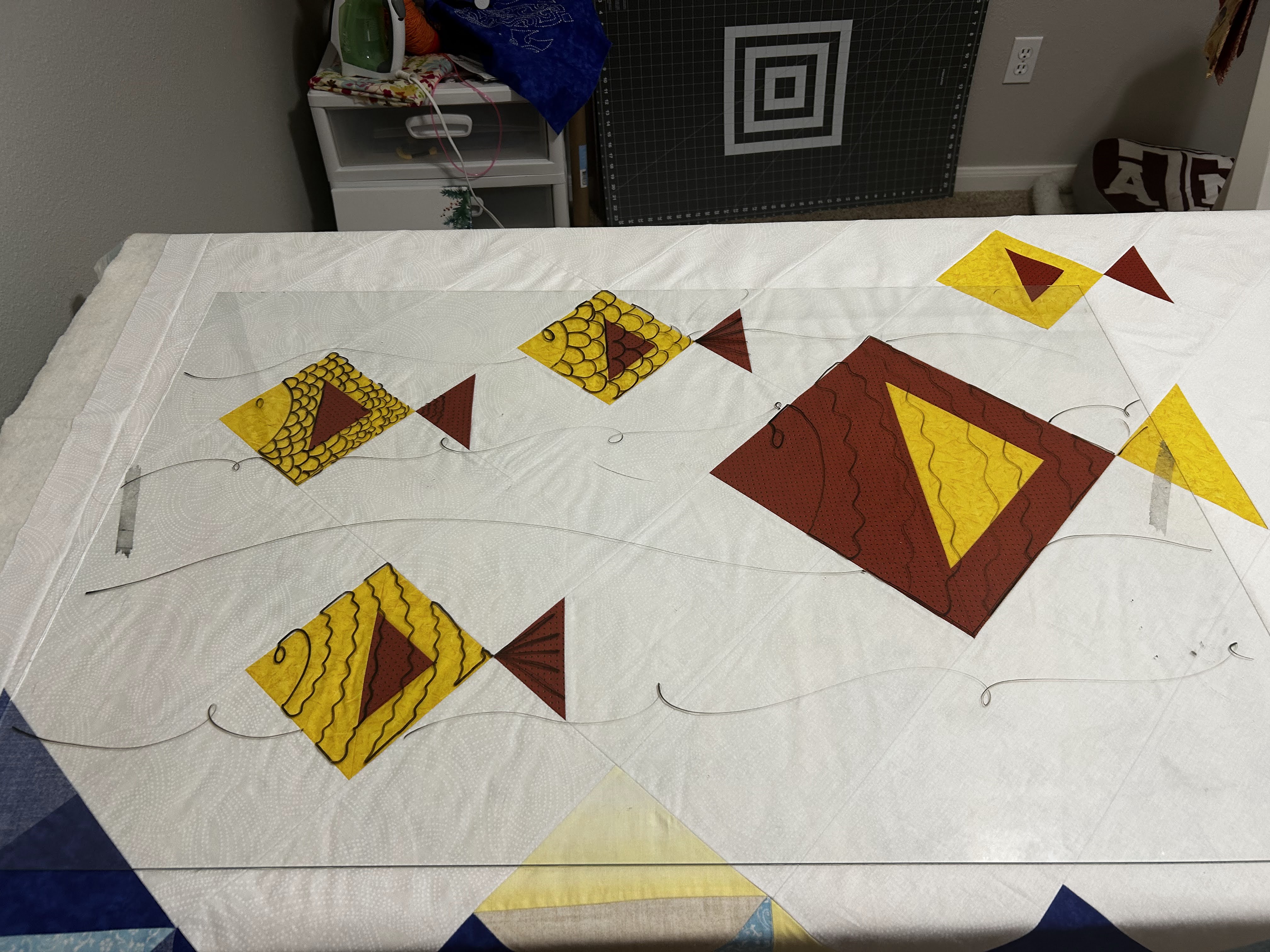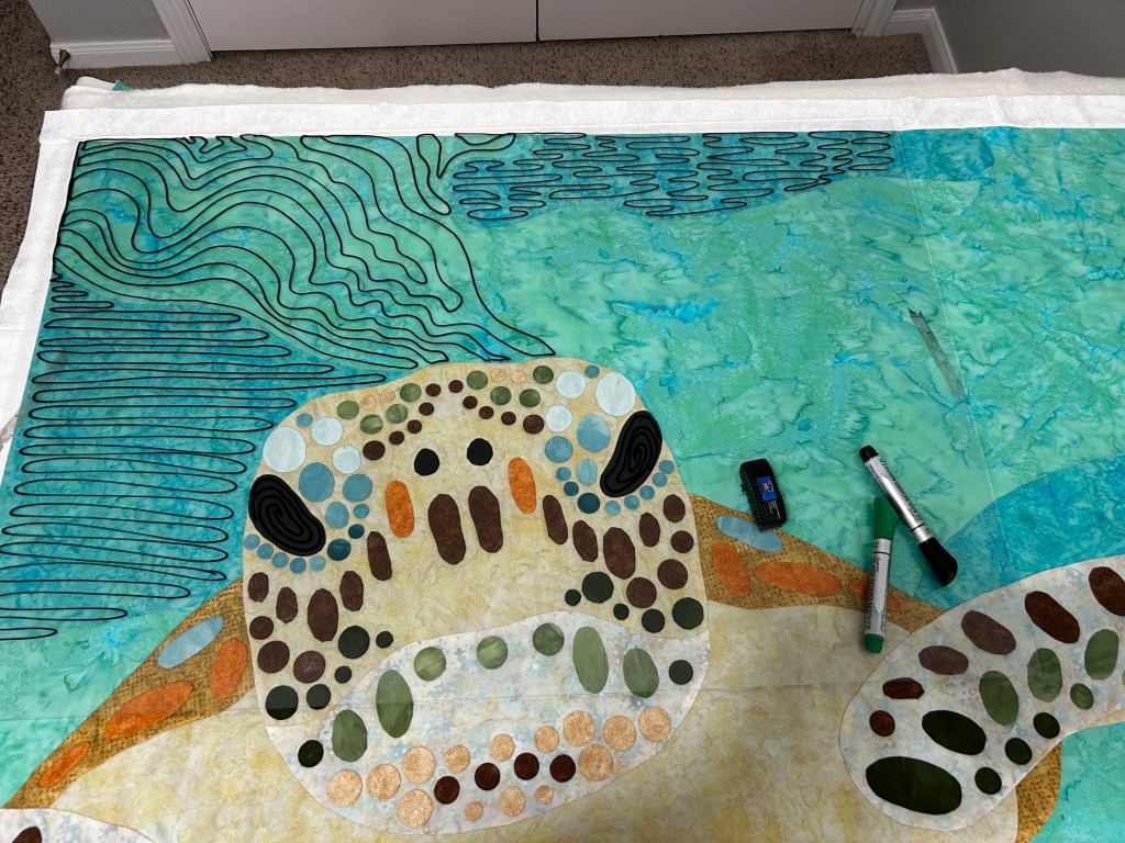 As usual, I audition the quilting pattern on my glass with dry-erase markers. To get comfortable with spacing on the first few small fish, I drew the pattern with Pilot Frixion erasable pens.