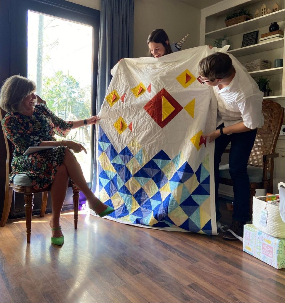 This was my first quilt on point. Since I made the pattern from an image, I might have treated the waste and HST differently than intended. This was also the first time I made prairie points and I LOVED the look with the fins. Once the border was on, that white frame really finished the look of the top and, like so many quilts I’m proud of, I was so sad to have to gift this one on. I would have happily kept this blanket, but I know the Mom really appreciated the gift.