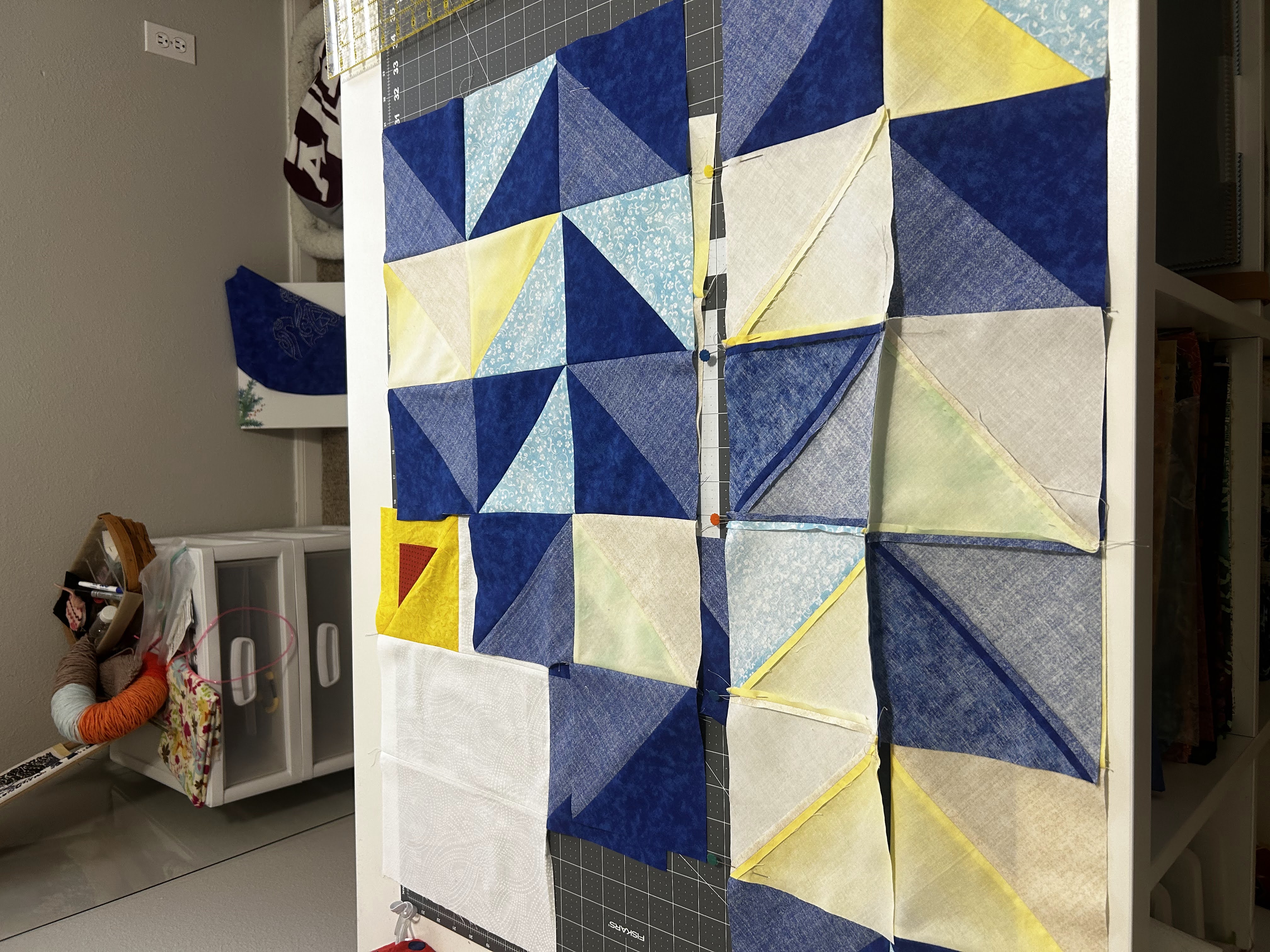 I laid out the half-square triangles on the floor – not a design wall in sight. In the photo below, you can even see the small cutting mat I was using back then.